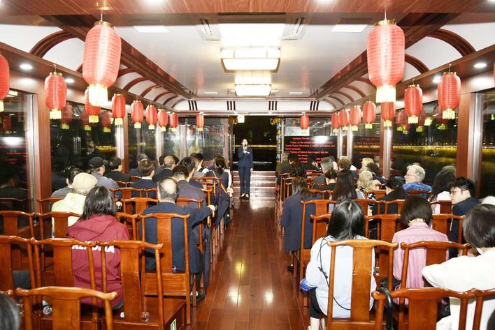 9.6公里航程中,灯光秀与专业解说交织,每处光影、每段故事,都让人“触摸”扬州与运河相互成就的血脉联系,沉浸式感受扬州的千年风华。嘉宾们不仅饱览了扬州的秀美夜景,更沉浸式体验了扬州的历史文化。“真是一场神奇的演艺,船在水中走,人在画中游,讲述的都是运河和扬州故事。”一位来自欧洲的嘉宾竖起了大拇指。